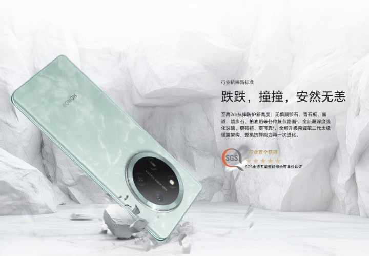 荣耀X60采用的升级的太极缓震架构2.0,机身正面采用了强度更高的超深度钢化玻璃,结合四角蜂窝设计和高弹态缓震材料,使得该机的抗摔能力得到了显著提升。荣耀X60通过了瑞士SGS三杆弯折、整机刚度、温度循环等15项测试,是行业首个获得SGS金标五星整机综合可靠性认证的手机。